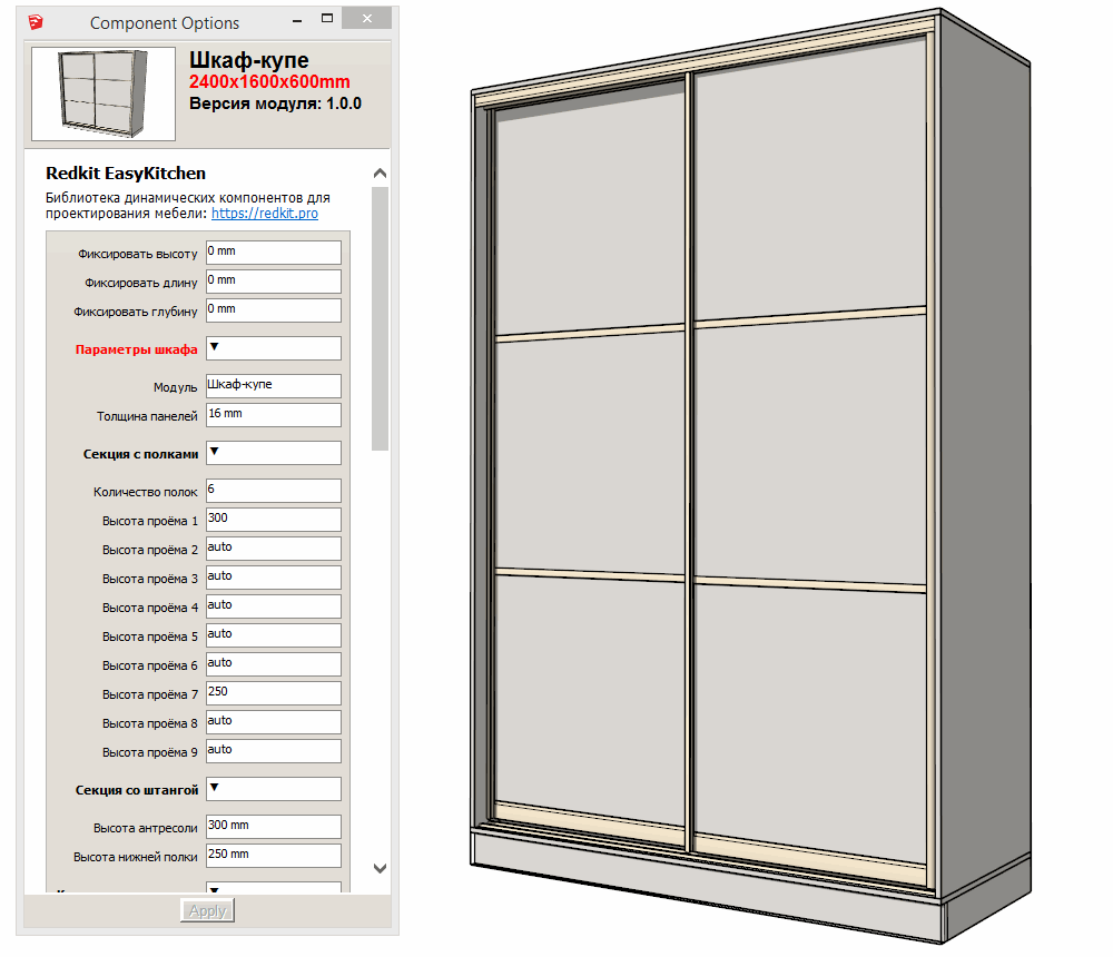 Добавили на сайт первый динамический шкаф-купе, основанный на библиотеке EasyKitchen 4. До этого мы уже делали шаблон шкафа-купе, но он был основан на 3й версии библиотеки и давно устарел.