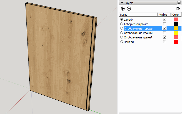 В слоях появится новый пункт "Отображение граней". Если убрать с него галочку, то скроется вся геометрия панели. Но это не сказывается на слоях с отображением кромки и габаритной рамки. Такой функционал позволяет быстро посмотреть - нет ли кромки на примыкающих к другой панели торцах.