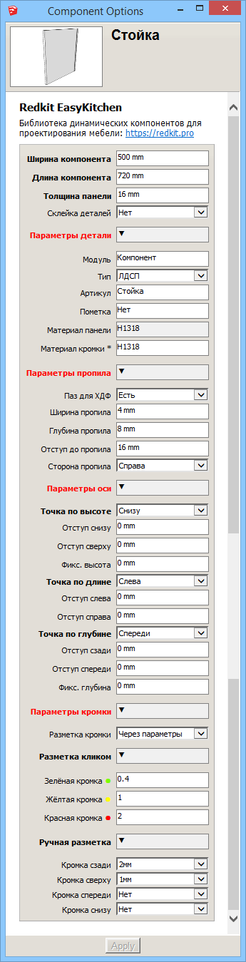 Вес панели играет большое значение. Несмотря на более широкий функционал новых панелей, их вес практически не изменился. Базовая вертикальная панель укладывется всего в 99КБ, что на 4КБ меньше, чем в текущей версии EasyKitchen 4.1. Выглядит не существенно, но на деле это хороший прирост к скорости работы в SketchUp.