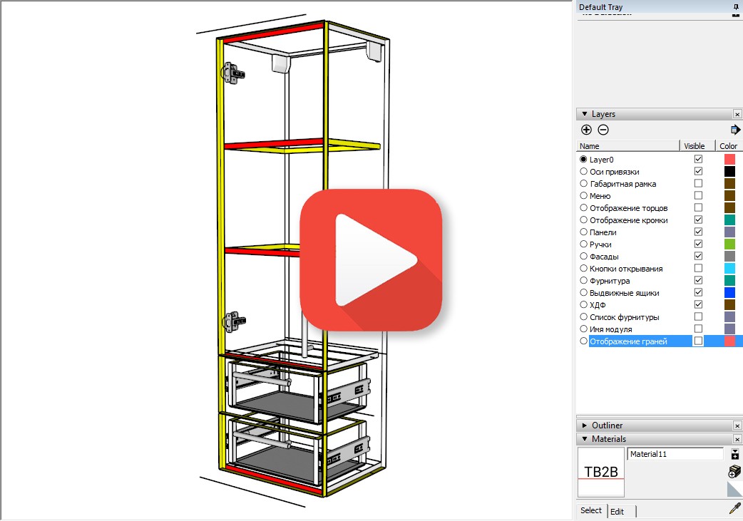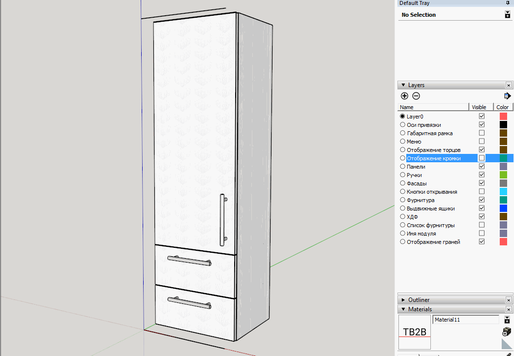 Но, решение есть! И оно легко решает обе ситуации! В новой версии библиотеки EasyKitchen для SketchUp, через слои можно будет отключить отображение граней. При этом, если будет включено отображение кромки, то вы получите своего рода прозрачный скелет, где будут видны все кромки и их цвет (тип). Вам останется только разметить кромку как требуется! Не нужно заходить внутрь модуля, двигать панели и включать режим "Рентген". Всё как на ладони!