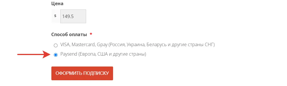 Начните оформление подписки на нашем сайте и выберите способ оплаты Paysend:
