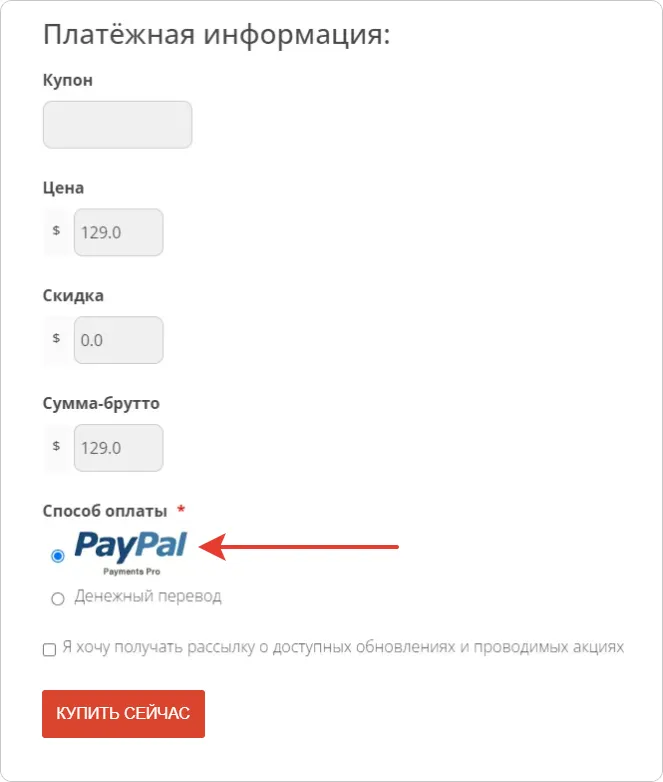 1. При оформлении покупки выберите способ оплаты "PayPal":