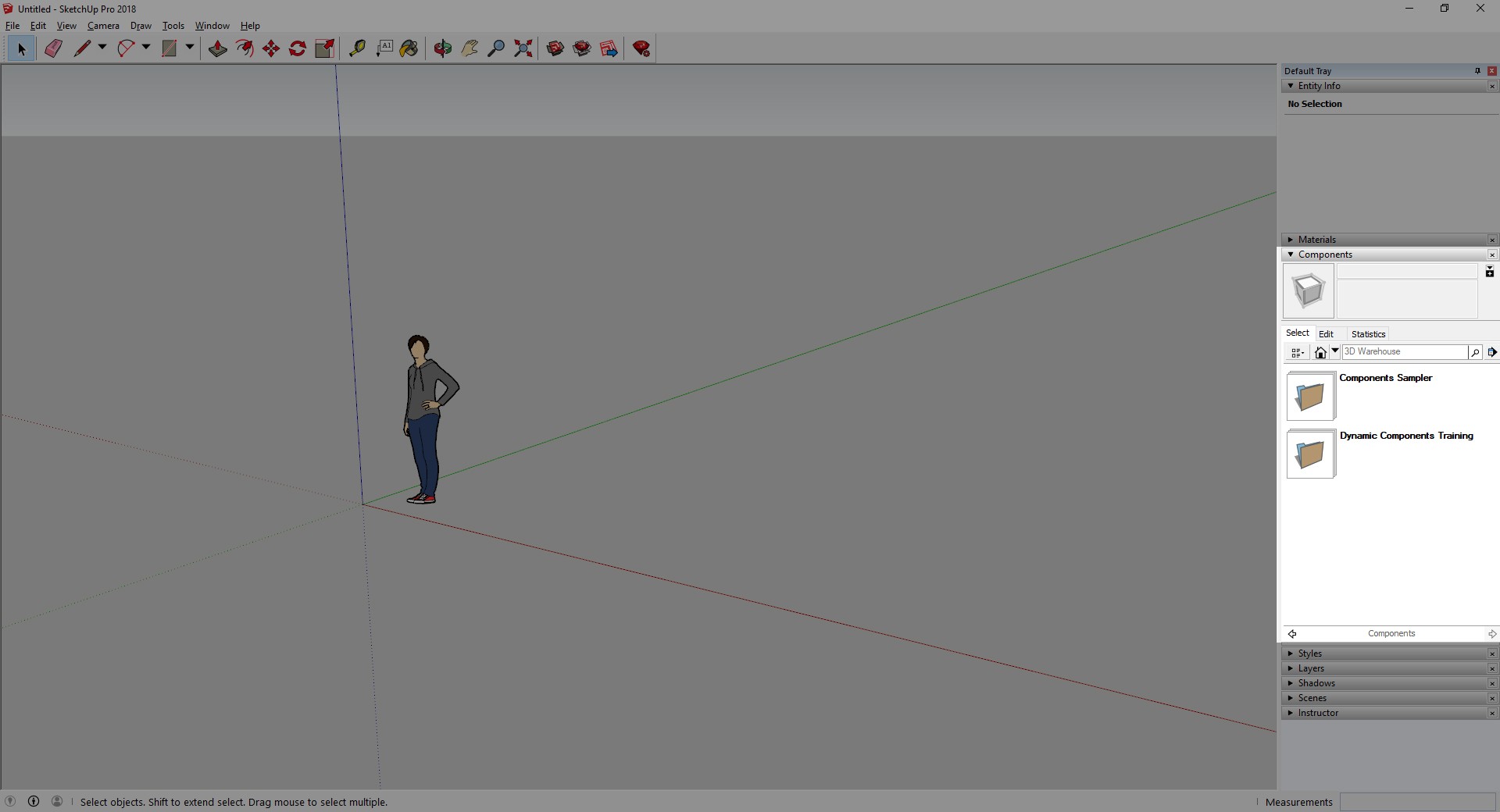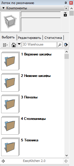 После установки EasyKitchen запустите программу SketchUp. В её правой части расположена панель "Лоток по умолчанию". В нём находим вкладку "Компоненты":