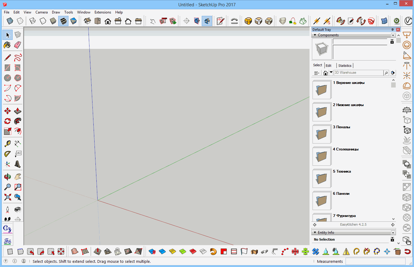 Note that the coordinate axes are displayed in the SketchUp workspace, and it’s very convenient to start building your project from the origin point.