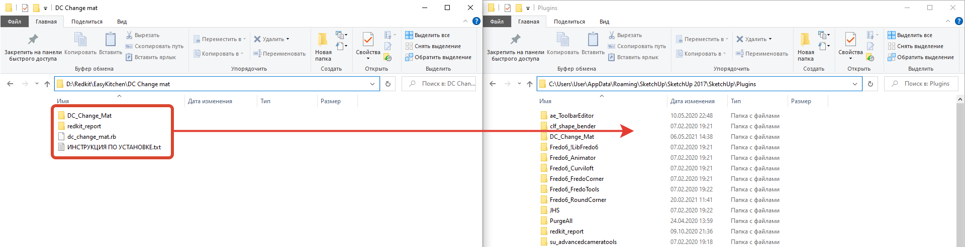 The final step is to install the DC Change Mat plugin, which comes with the EasyKitchen PRO library. It is located in the folder with the same name. It is recommended to simply move the contents of the DC Change Mat folder to the SketchUp plugins folder, approximately at the following path: